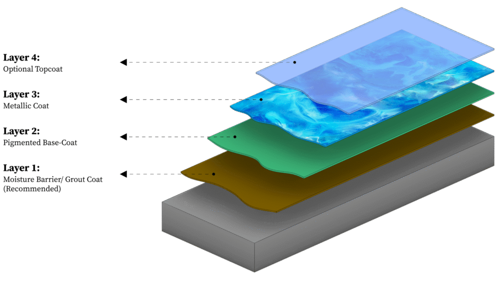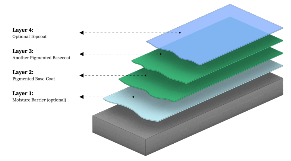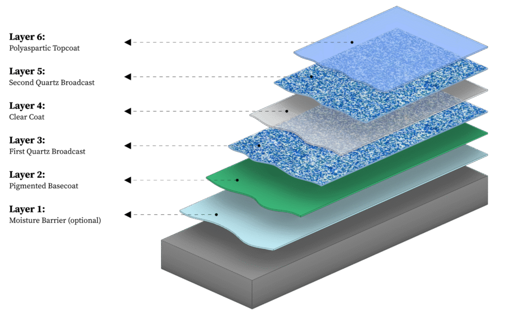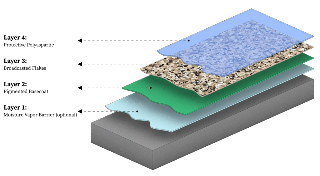 A multi-layered system comprising an epoxy base coat and vinyl flake chips is sealed with either a quick-drying polyaspartic topcoat or a polyurethane topcoat. This system is water and weather-resistant, chip, scratch, chemical and stain-resistant. Ideal for use in residential garages, outdoor surfaces and in busy commercial settings.
